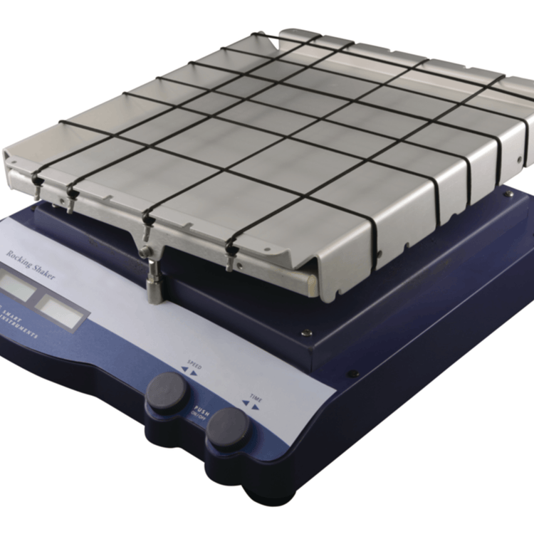 Shakers with different movements: see-saw rocking or 3D. Both shakers have a fixed tilt angle and provide two shaking modes: continuous or timer. The digital speed and timer displays ensure ease of use. The shakers are supplied with a platform with bungee cords.
